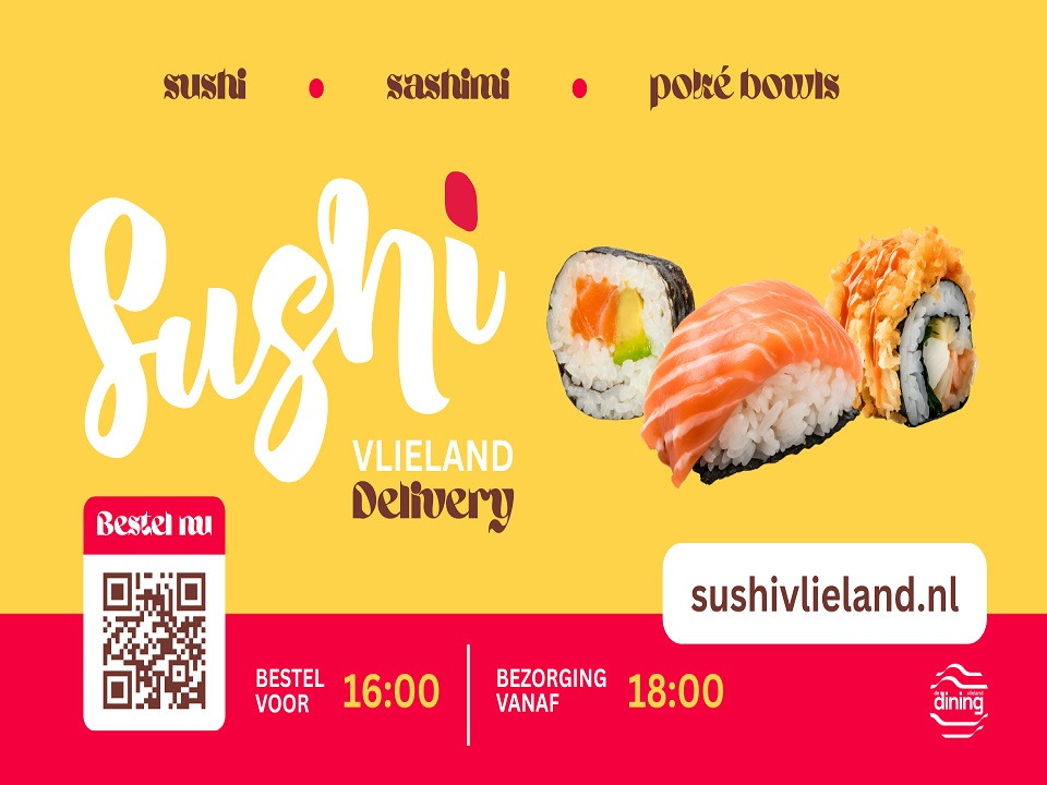 | Boek vast een restaurant voor de eerste avond | | Sushi Vlieland delivery |  | Sushi Vlieland: bestel voor 16 uur voor bezorging vanaf 18 uur. Bestel hier gemakkelijk je favoriete Sushi, vers voor je gemaakt! - sushi - sashimi - poké bowls - Bestel tijdens openingstijden van de Dining in december: - elke vrijdag t/m zondag - tijdens de Kerstvakantie elke dag! Maak jezelf blij met verse, heerlijke sushi aan huis bezorgd. |